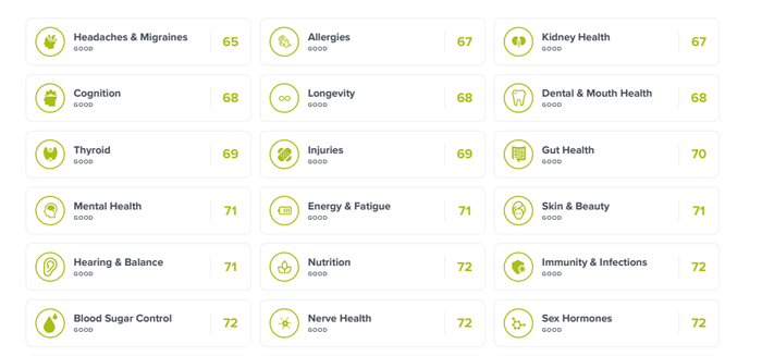 - Благосъстояние и дълголетие: възпаления, риск от алергии, здраве на костите, здравословно стареене, дължина на теломерите.