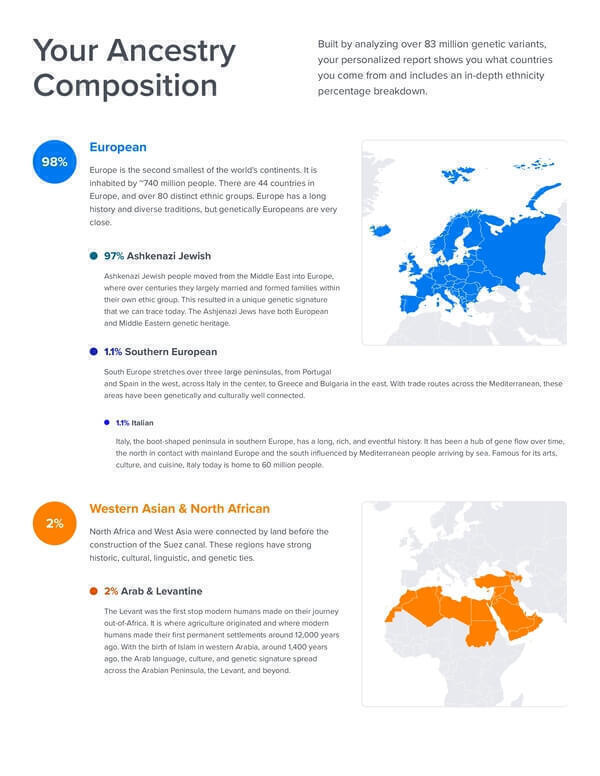 The ancestry report, based on more than 83 million genetic variants, comes in PDF format with percentages by region (35) and interactive mapping. SelfDecode also analyzes your mitochondrial DNA to present the ancient migration patterns of your maternal ancestors over 230,000 years in its report.