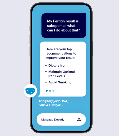 Инструментът DecodyGPT, AI здравен треньор на SelfDecode, е основната иновация на SelfDecode. Този асистент сравнява вашите генетични данни, кръвни изследвания и навици на живот, за да генерира ясен план за действие за здравето, който може да се прилага ежедневно.